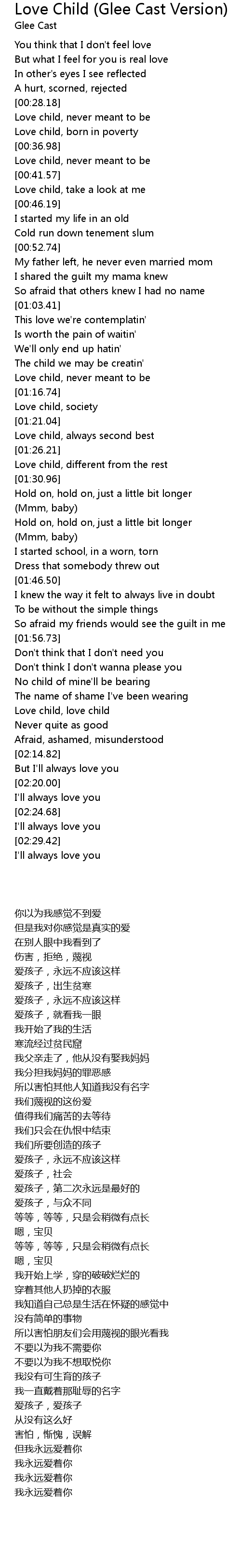 Hold on hold on just a little bit longer Mmm. You need me you do. Love child born in poverty Love child never meant to be Love child take a look at me I started my life in an old cold run down tenement slum My father left he never even married mom I shared the guilt my mama knew So afraid that others knew I had no name This love were contemplating Is worth the pain of waiting Well only end up hating The child we maybe creating Love child never meant to be.